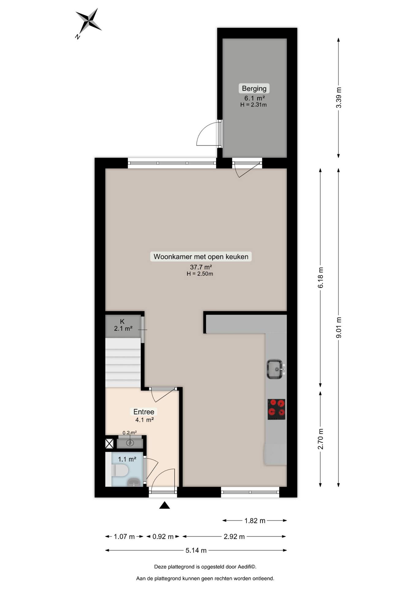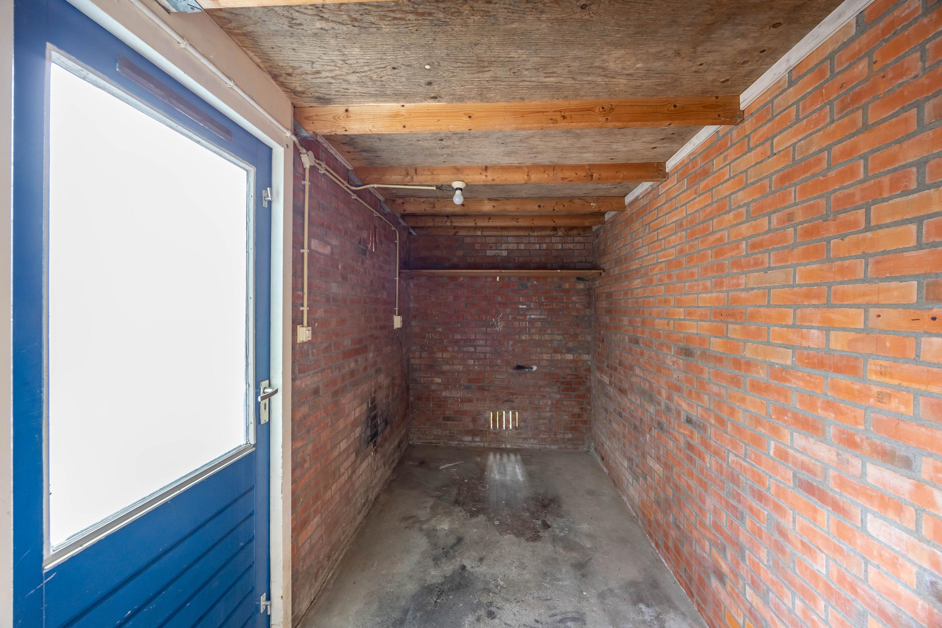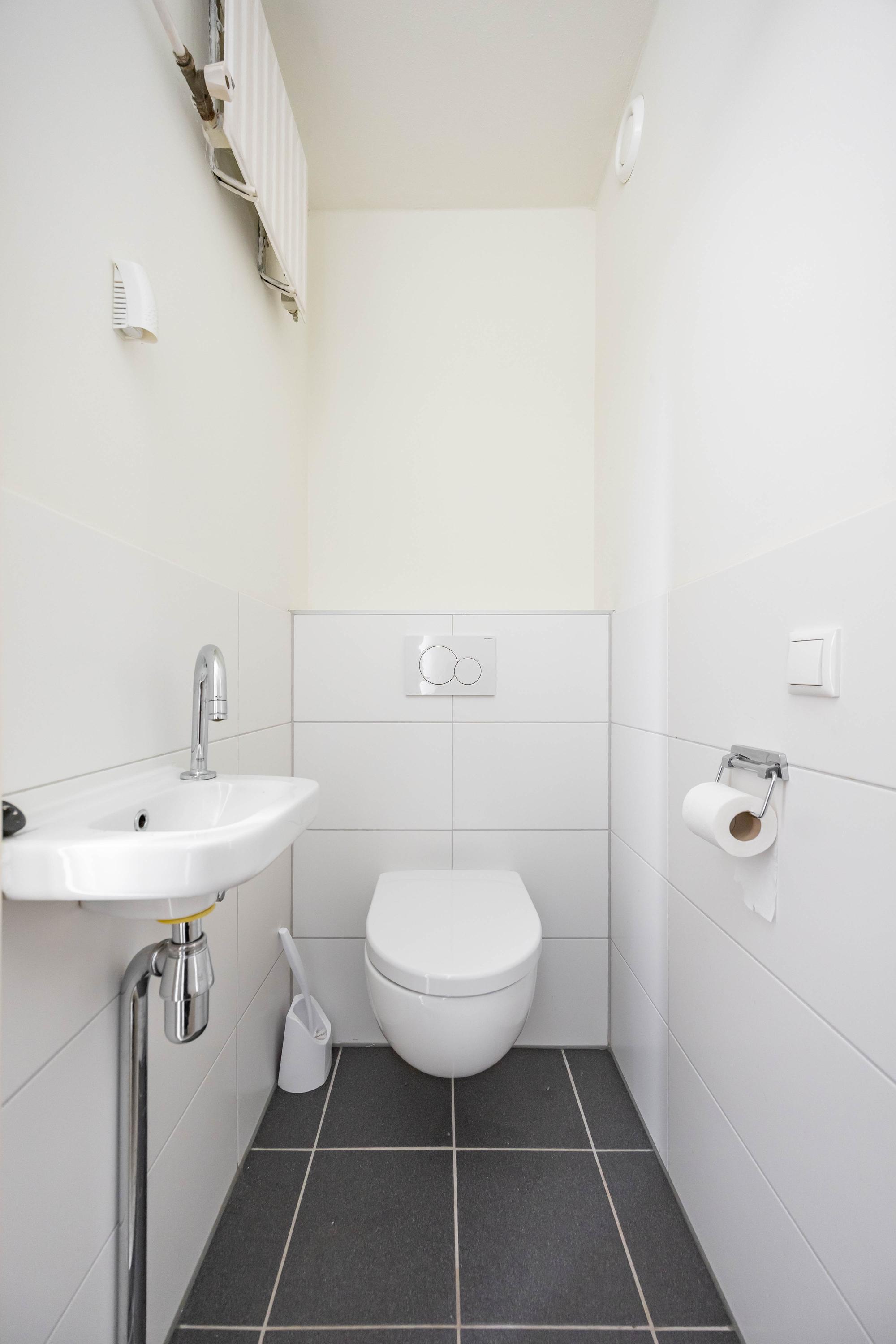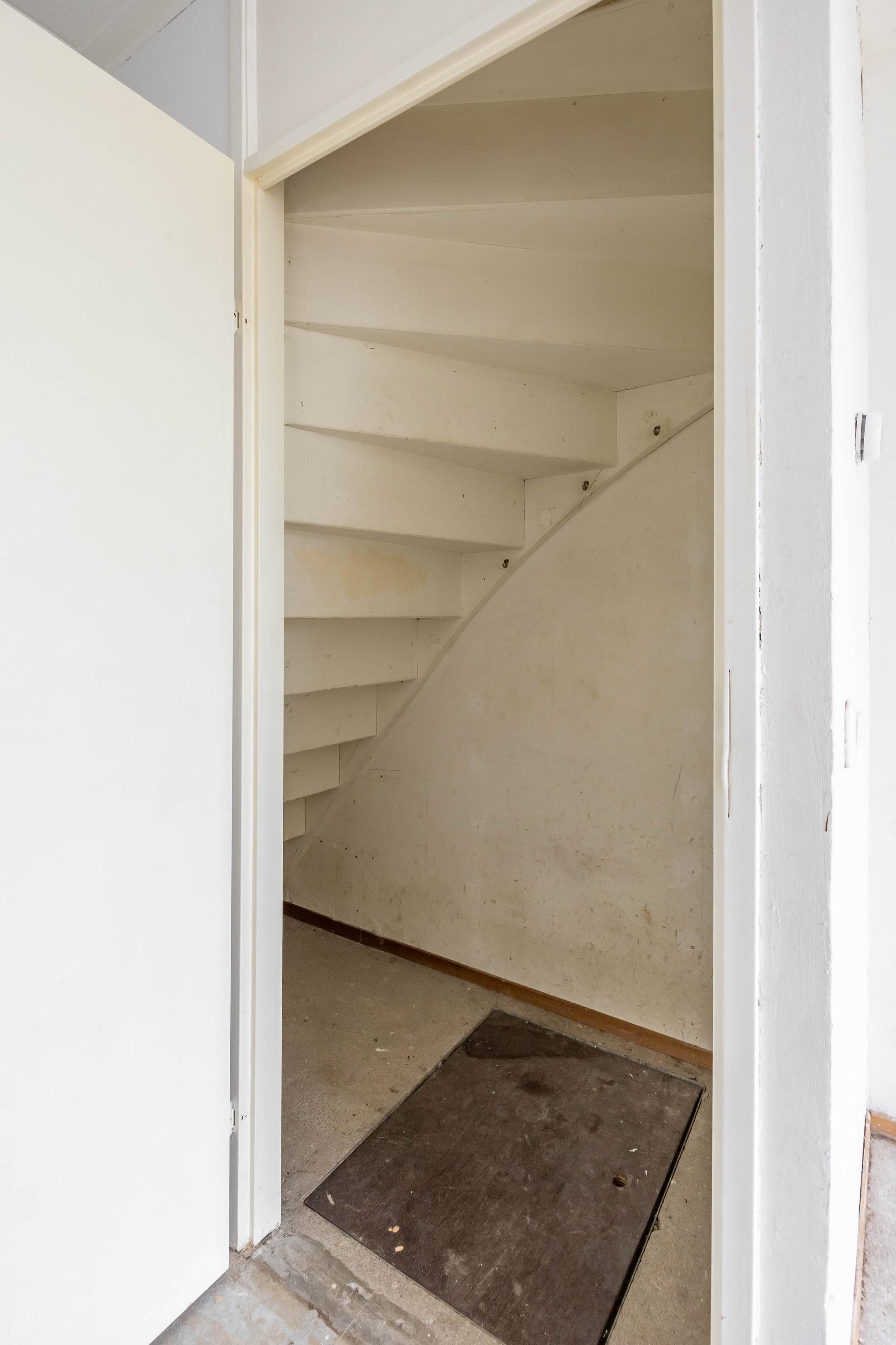 Binnenkomst in de entreehal. De ruime en lichte woonkamer biedt directe toegang tot de moderne open keuken, voorzien van diverse inbouwapparatuur. Vanuit de woonkamer is er toegang tot een praktische berging met een deur naar de tuin. In de hal bevinden zich het toilet en de trapopgang naar de eerste verdieping.