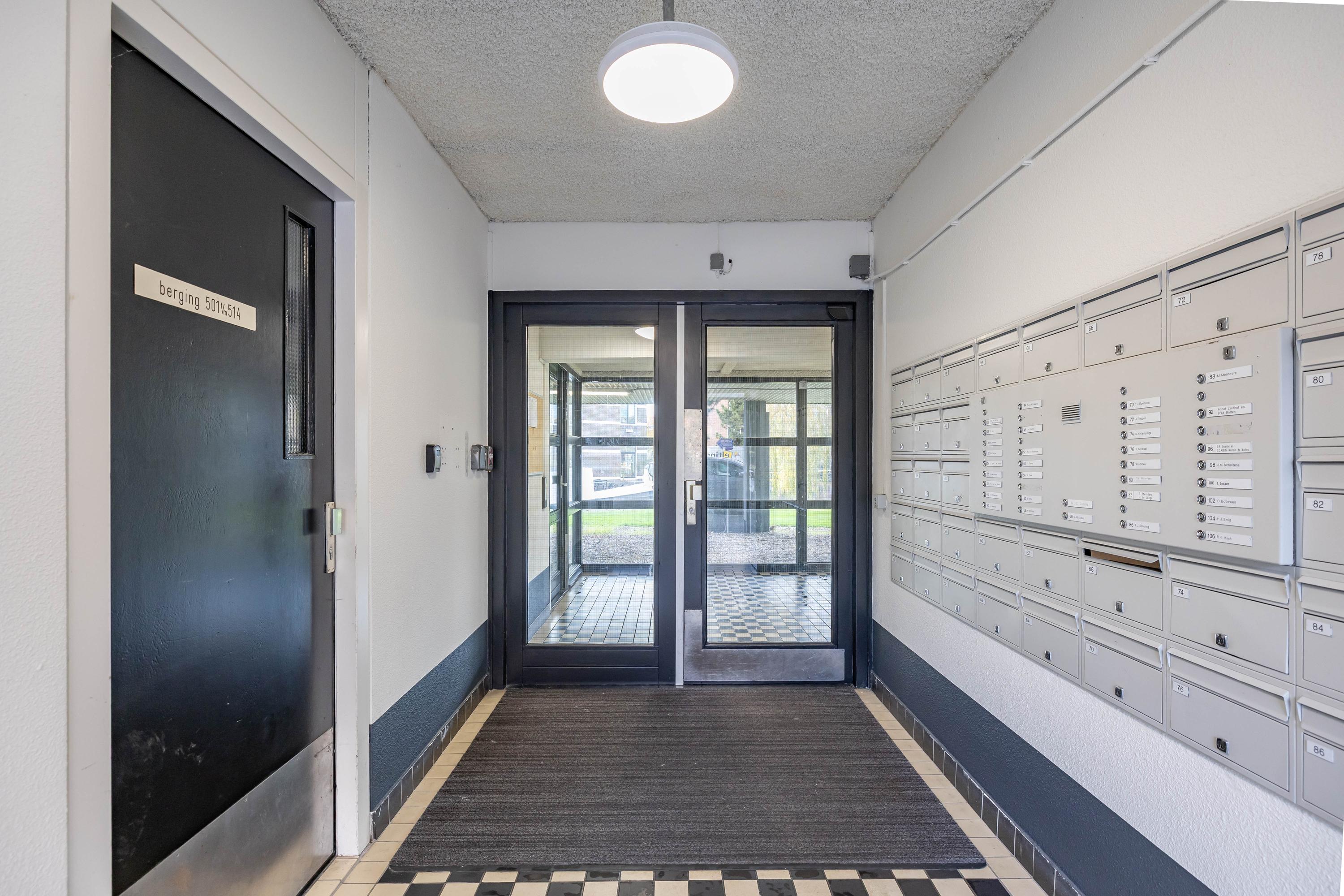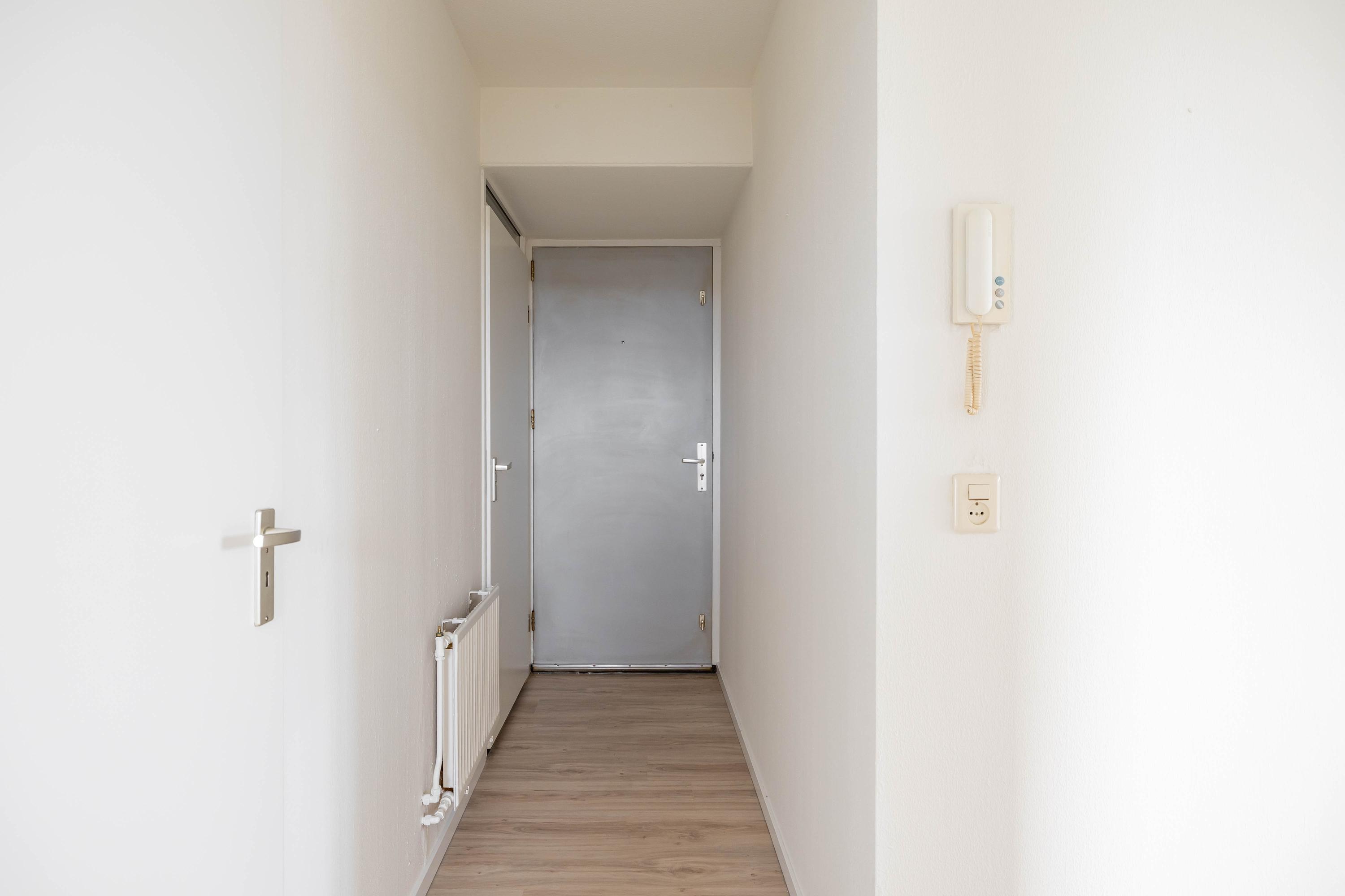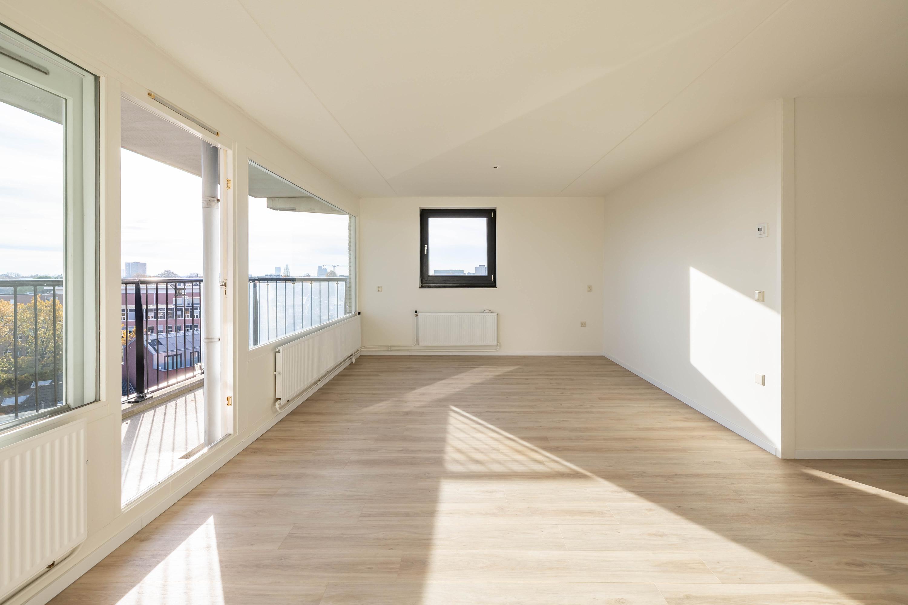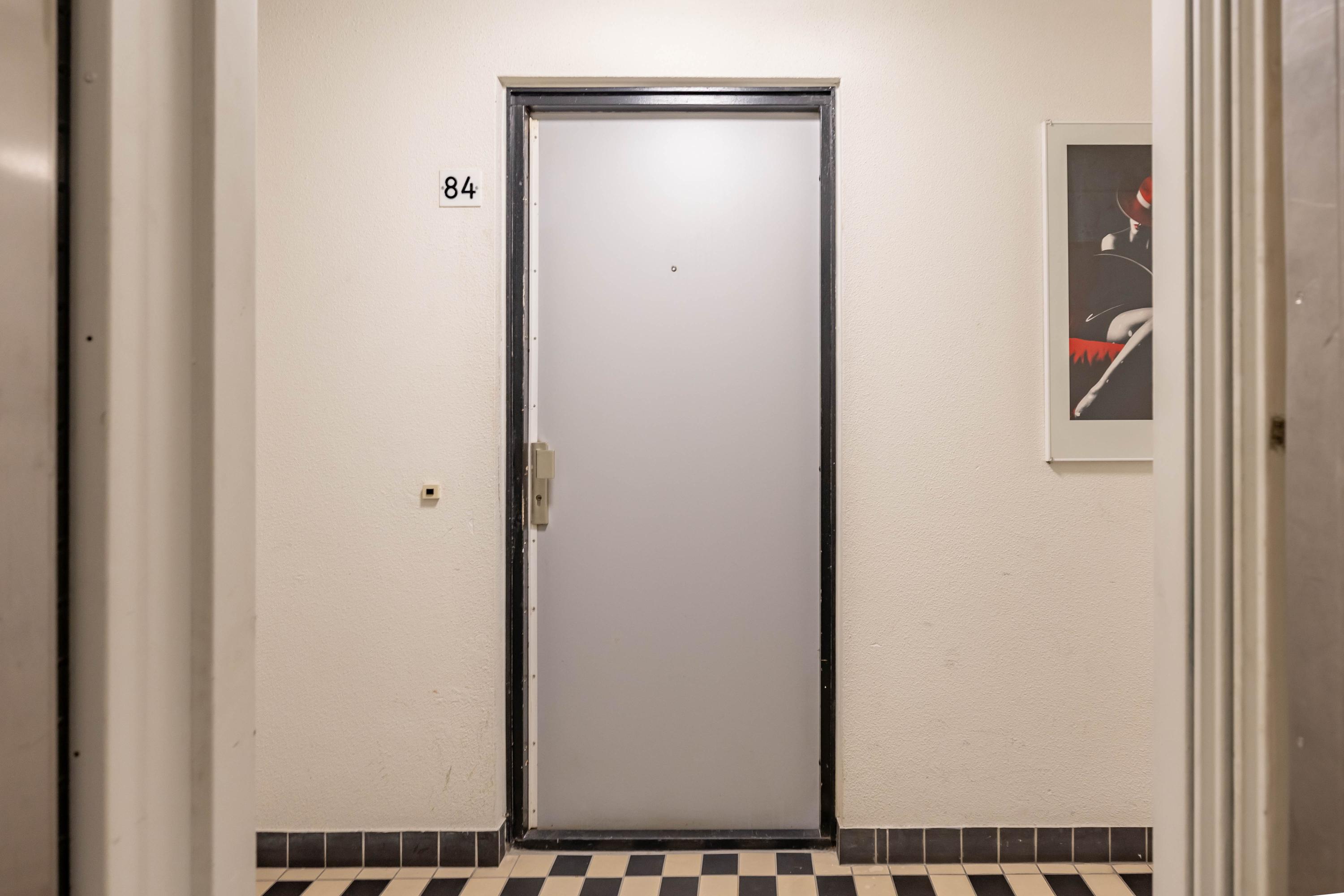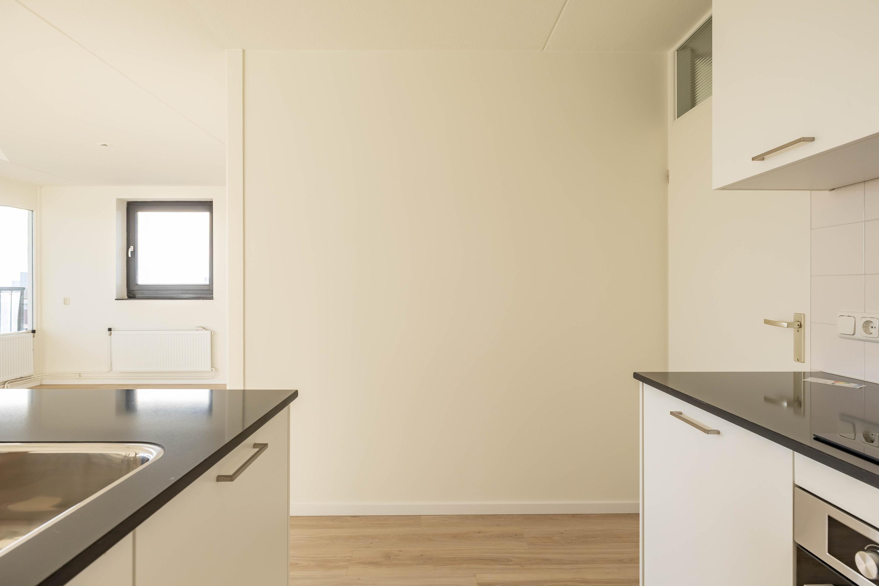 Indeling: entree, lift naar achtste woonlaag, entree appartement, gang met toilet, badkamer, twee slaapkamers woonkamer met open keuken, toegang tot balkon. Op de begane grond is een fietsenberging.