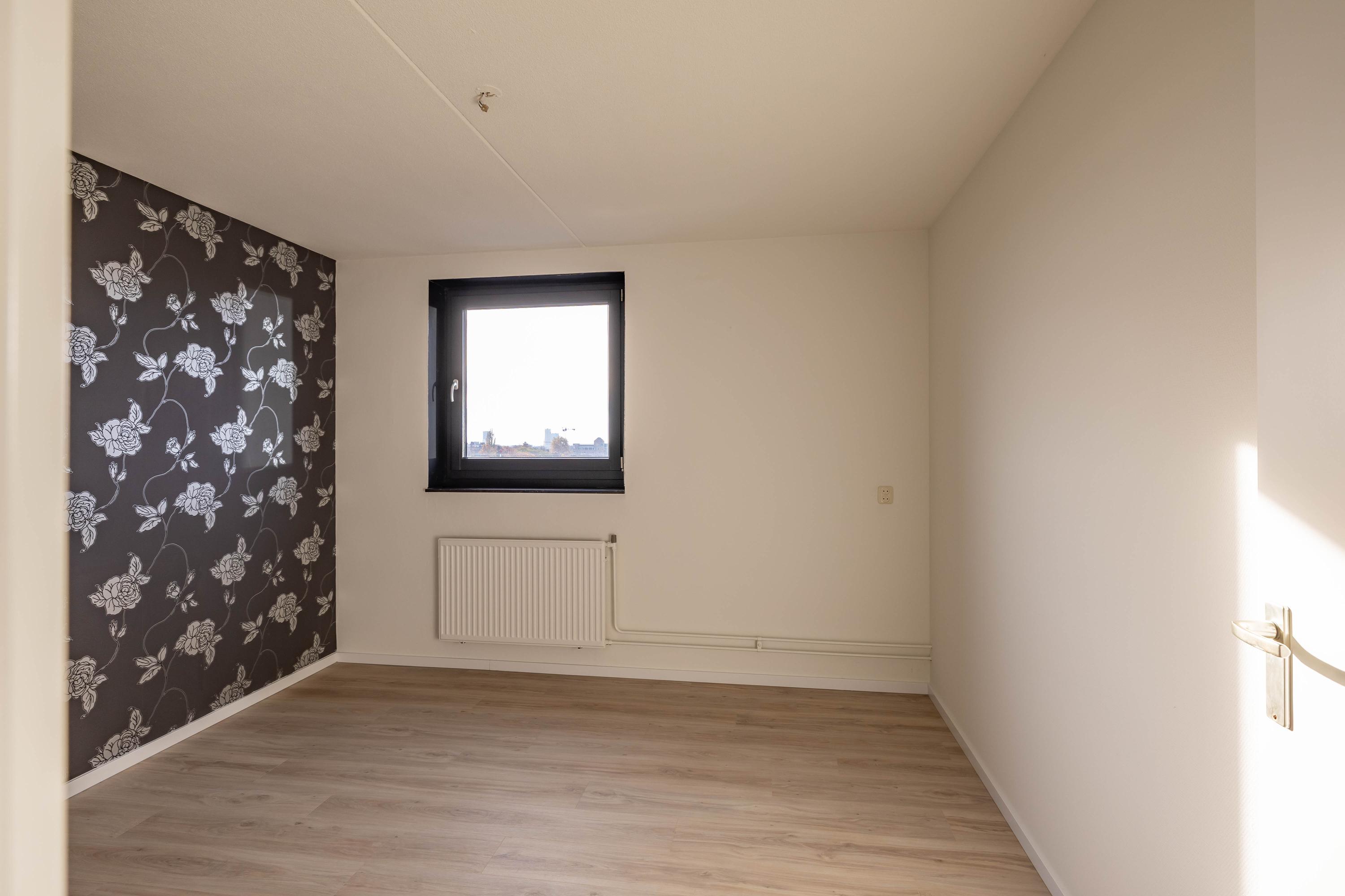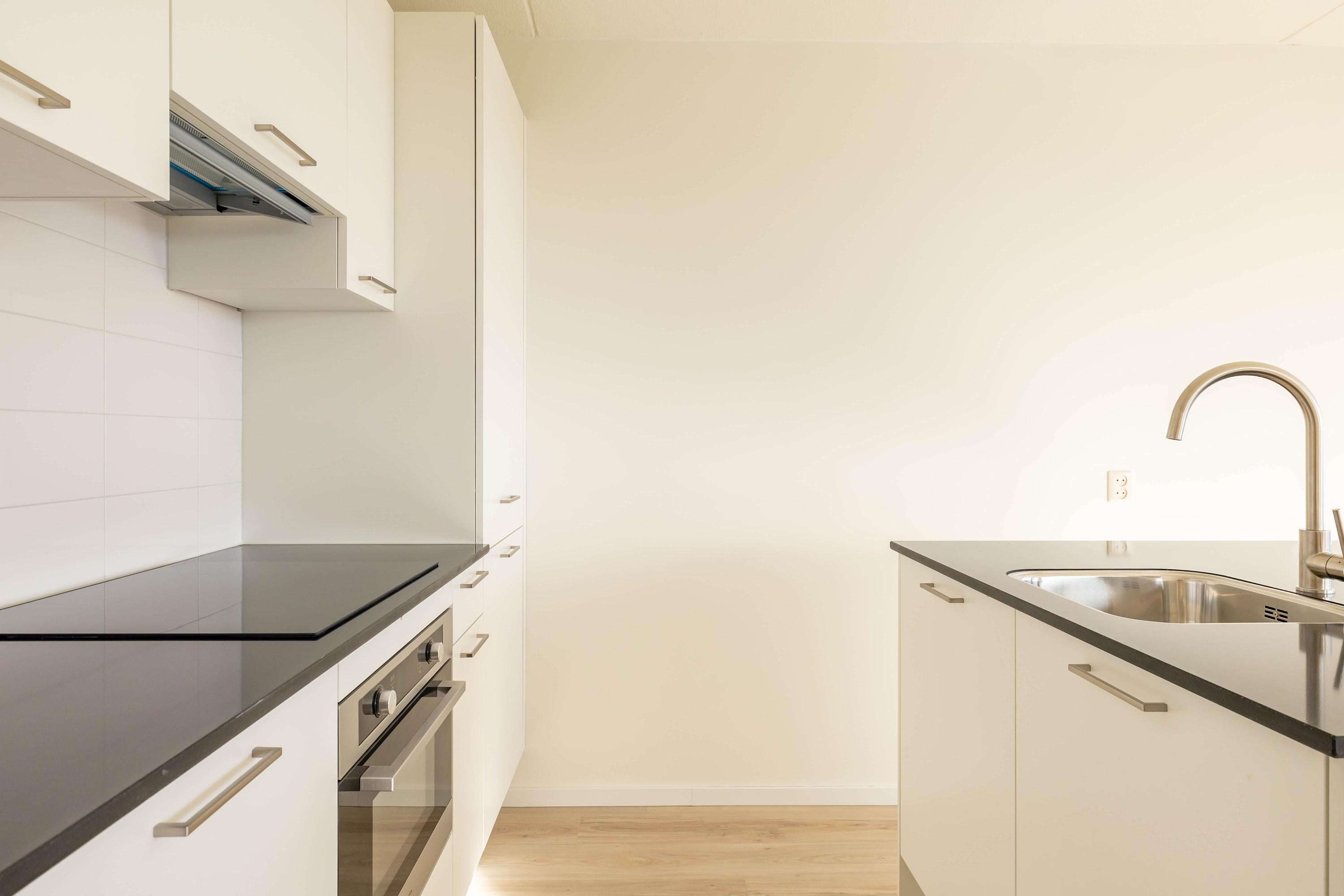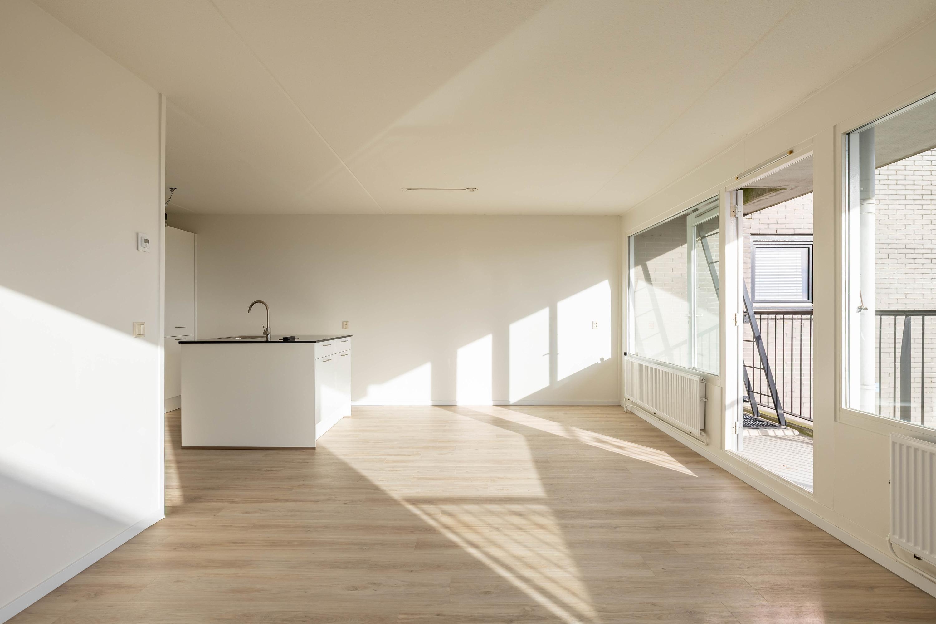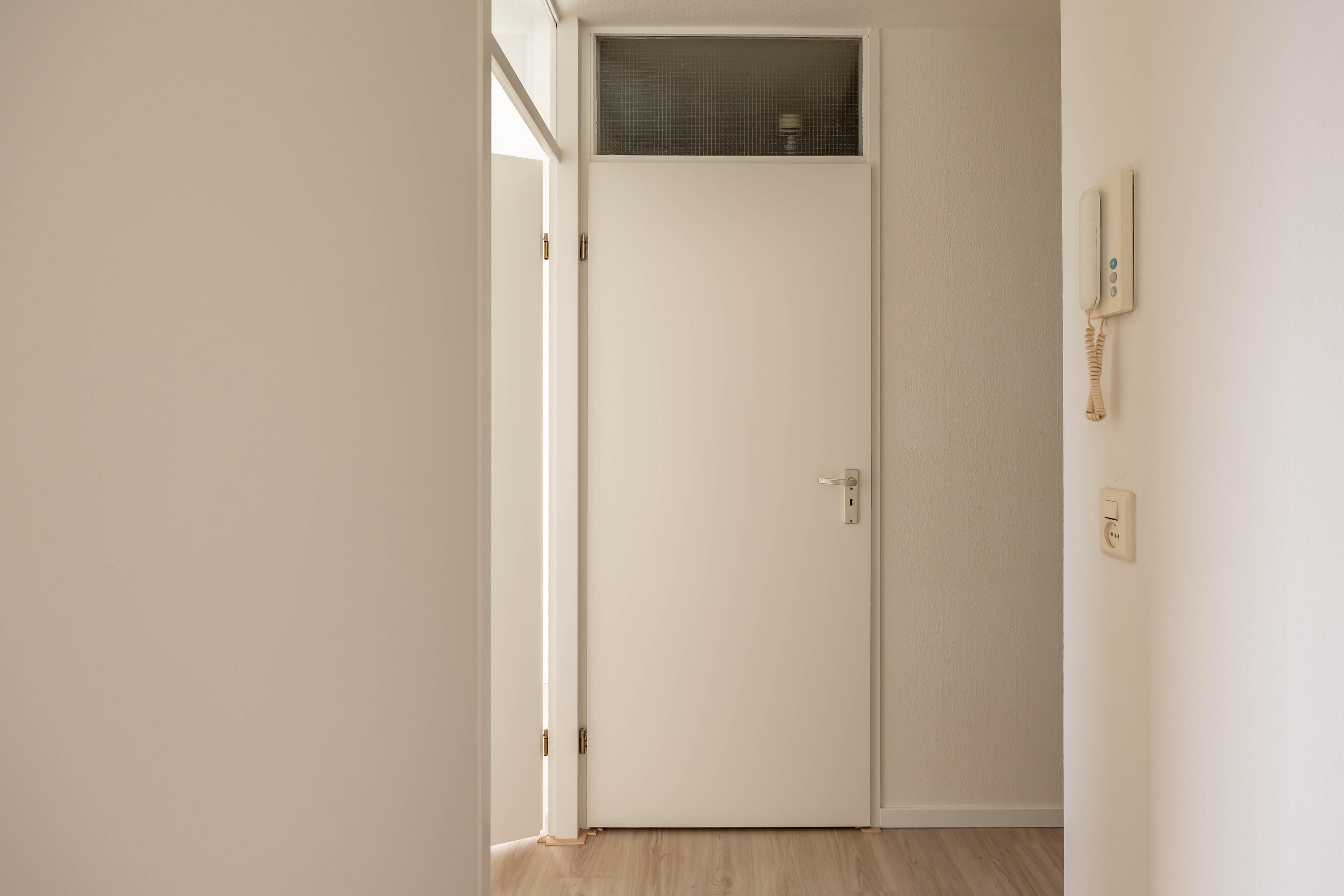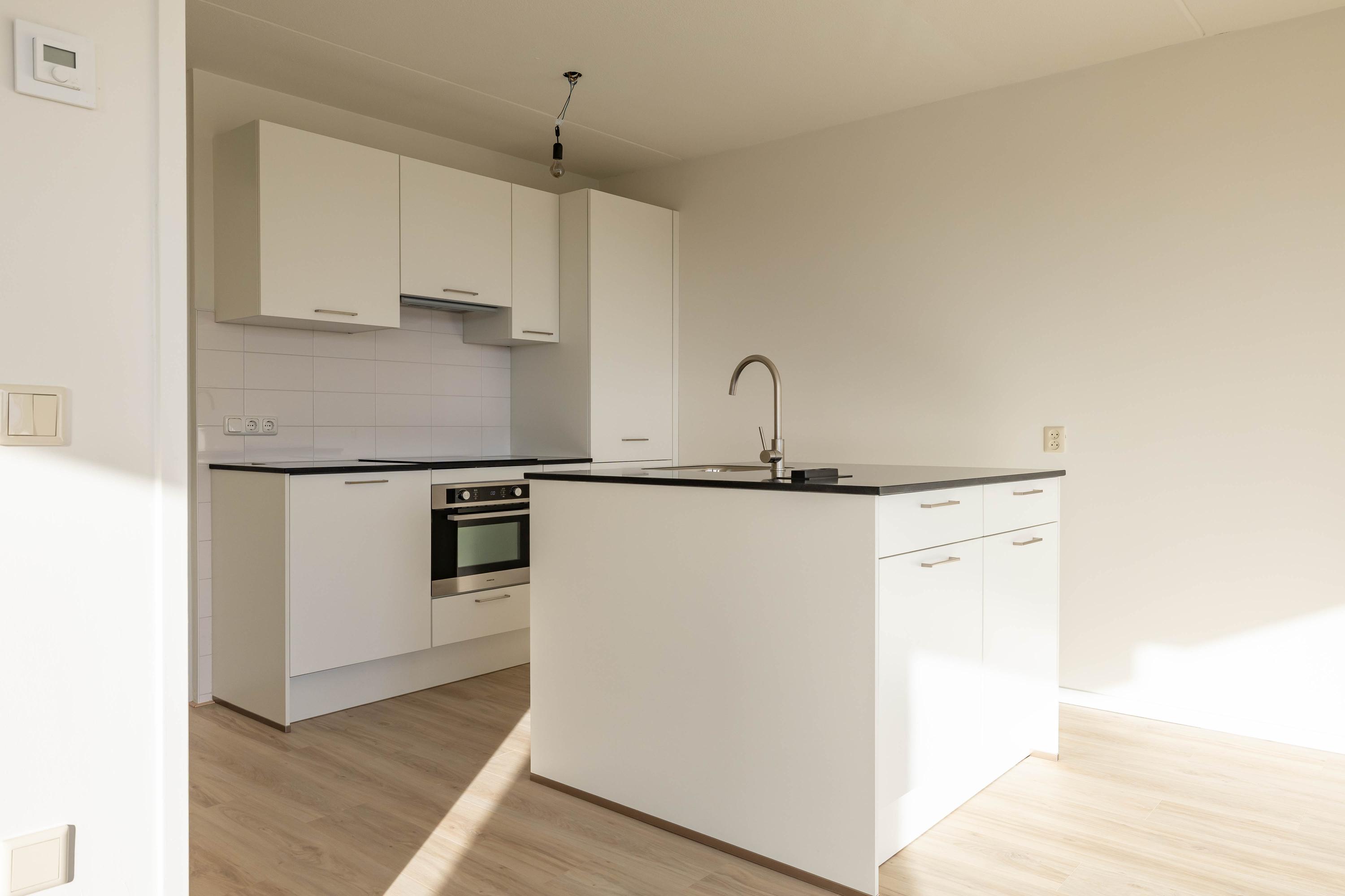 Indeling: entree, lift naar achtste woonlaag, entree appartement, gang met toilet, badkamer, twee slaapkamers woonkamer met open keuken, toegang tot balkon. Op de begane grond is een fietsenberging.