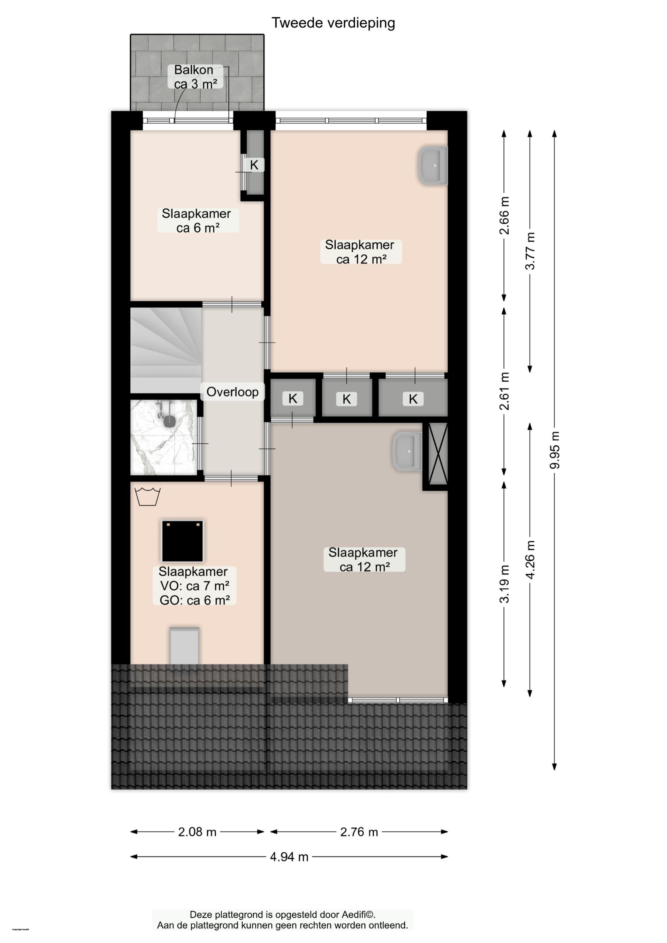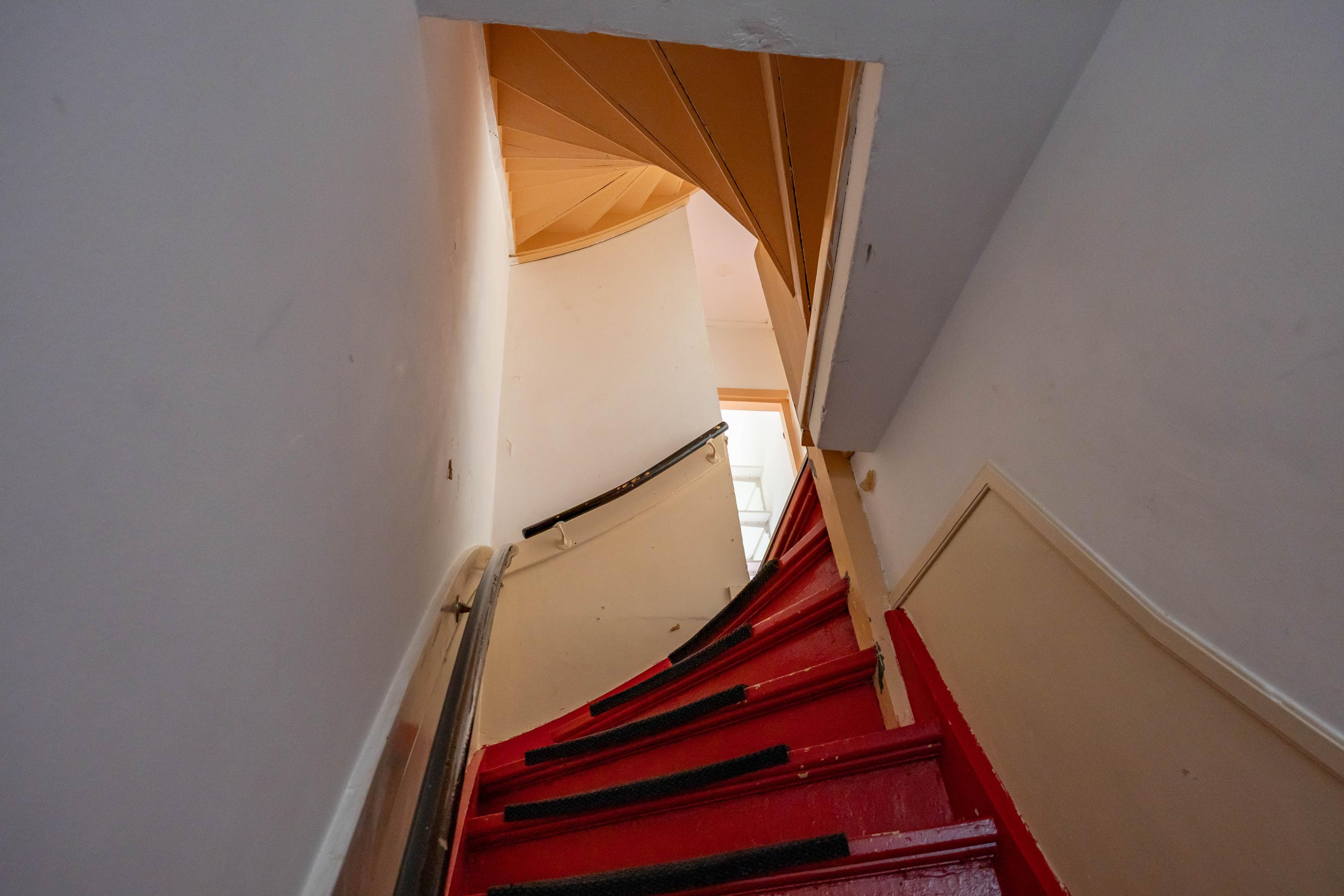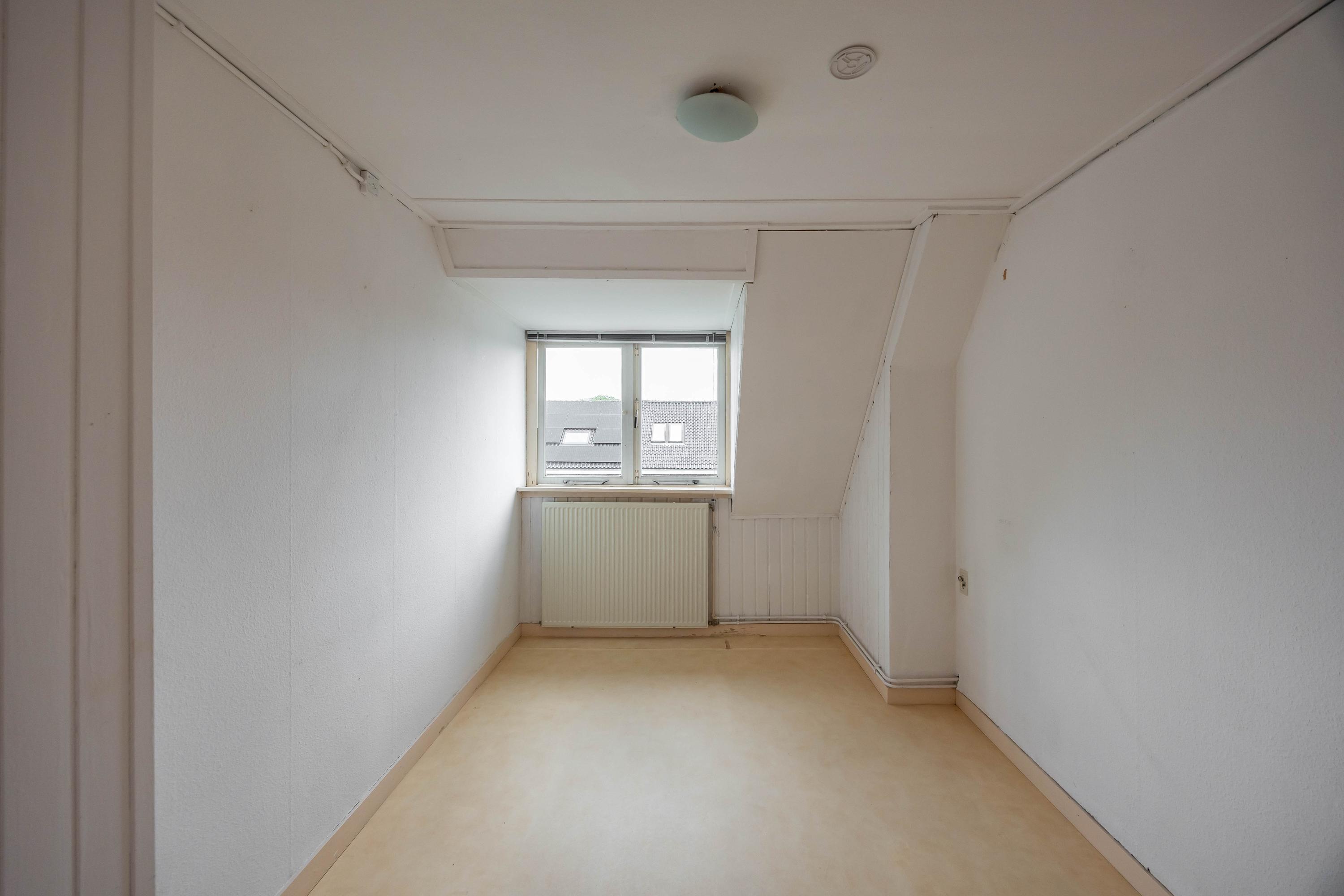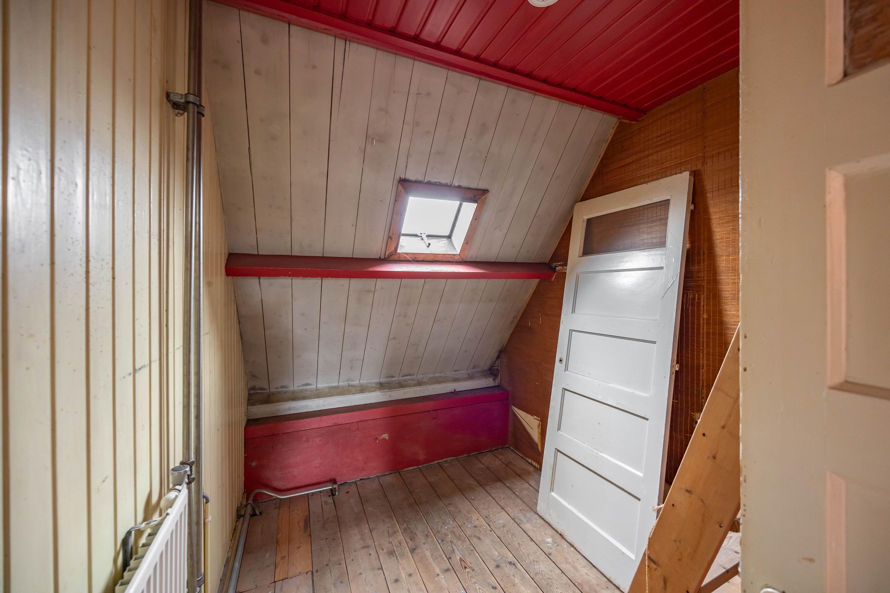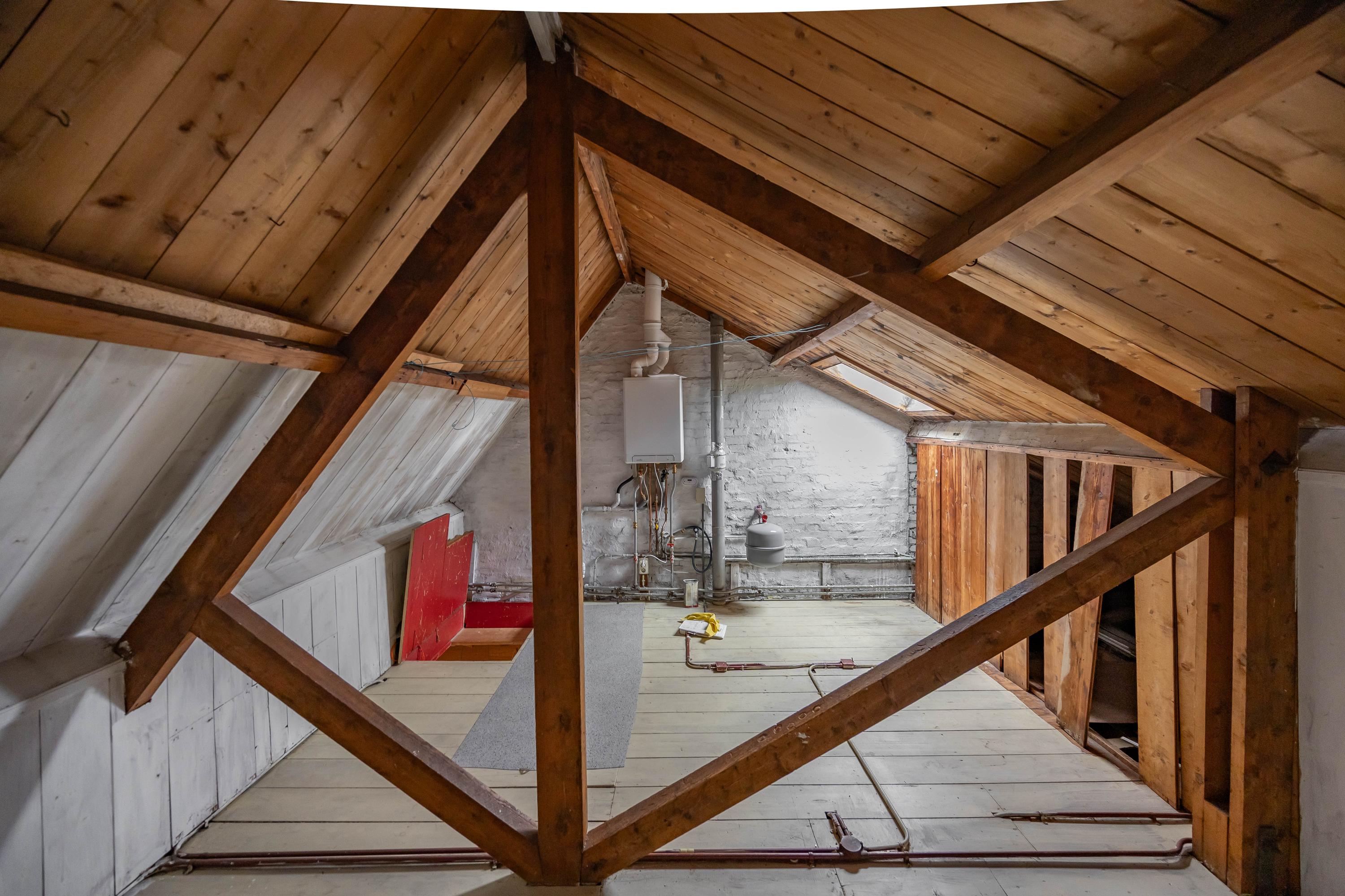 Indeling: entree, trapopgang, hal, royale woonkamer met openslaande deuren naar balkon, eenvoudige keuken aan de achterzijde. Verdieping: overloop met doucheruimte en vier slaapkamers van ca. 7, 12, 12 en 6m2. Via de slaapkamer toegang tot een balkon. Via een steektrap toegang tot de zolderruimte.
