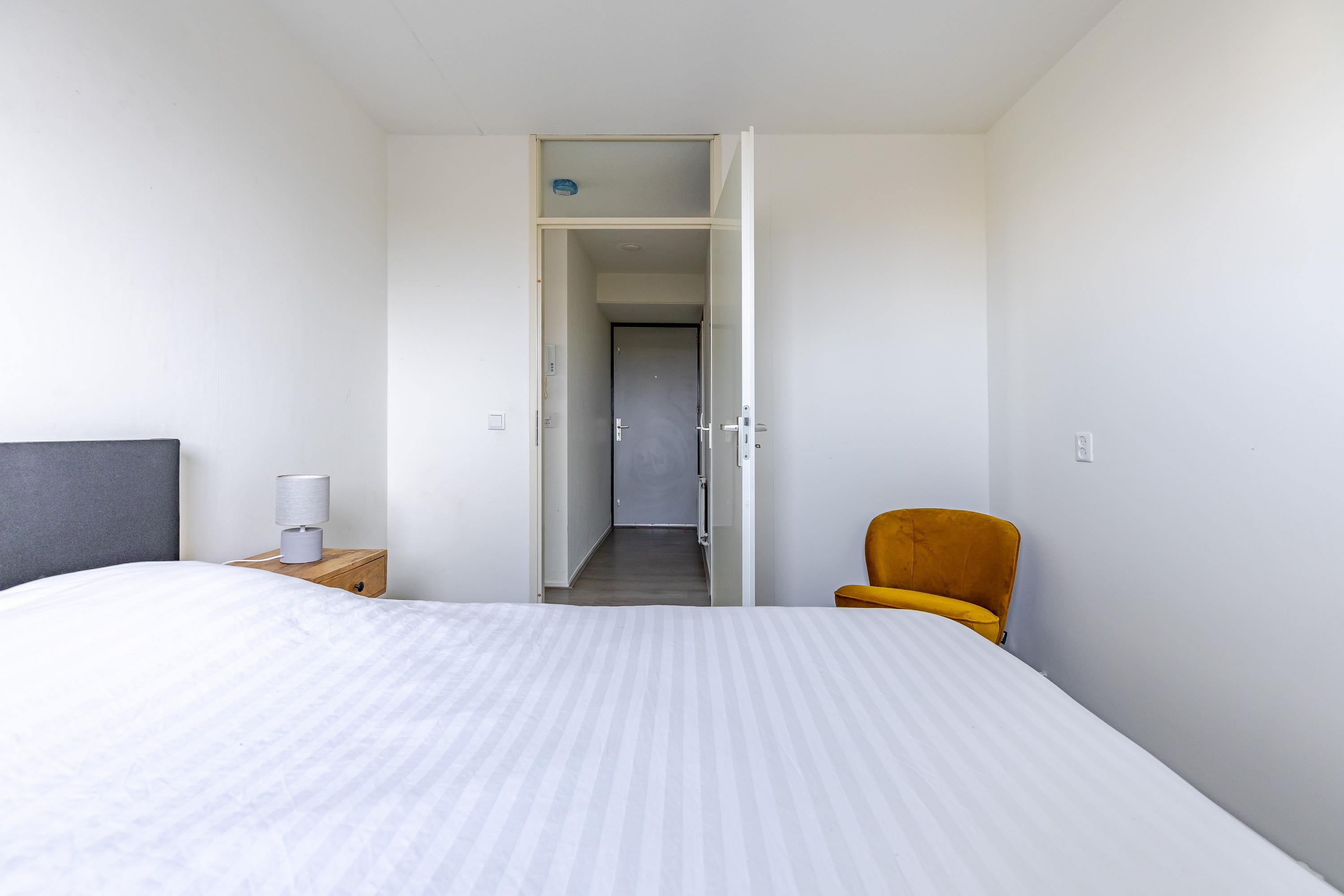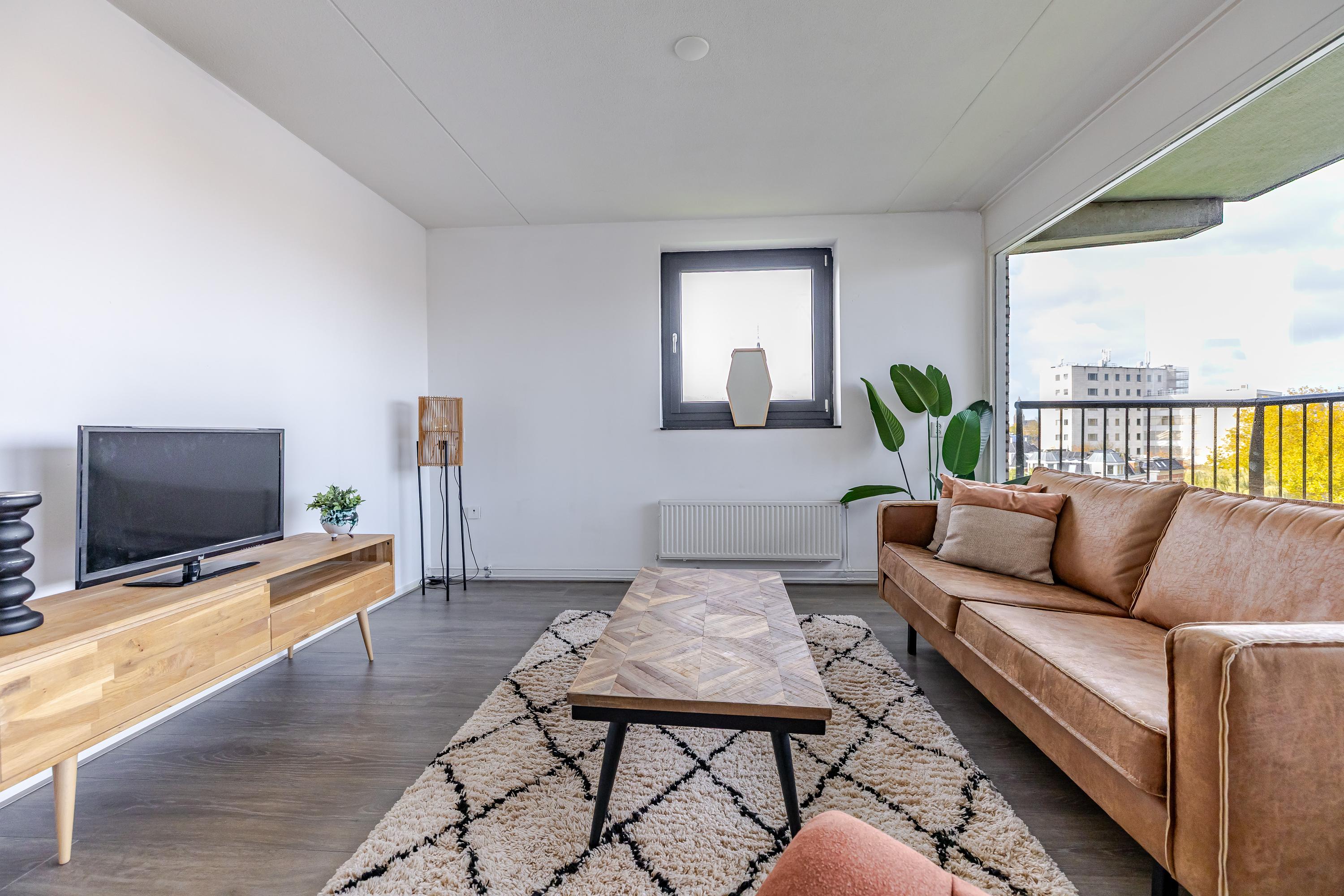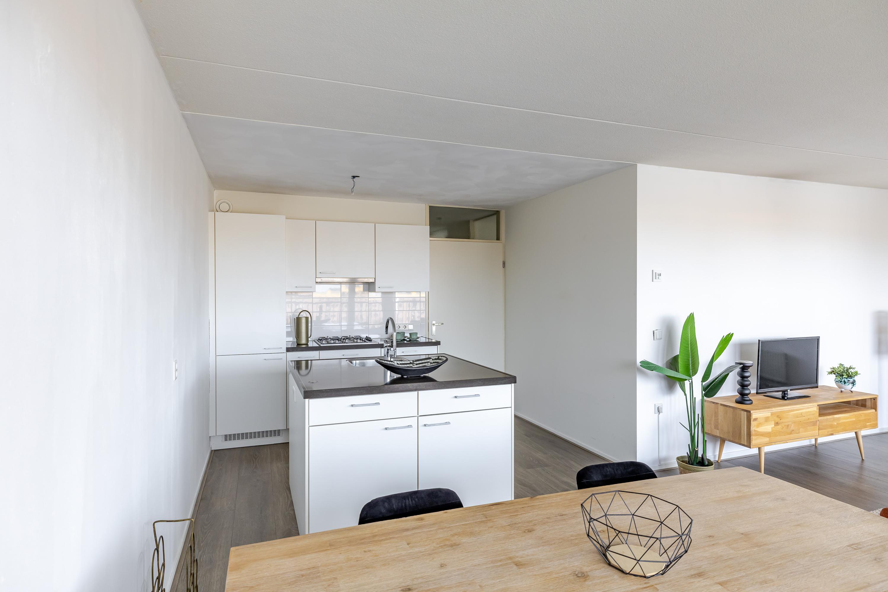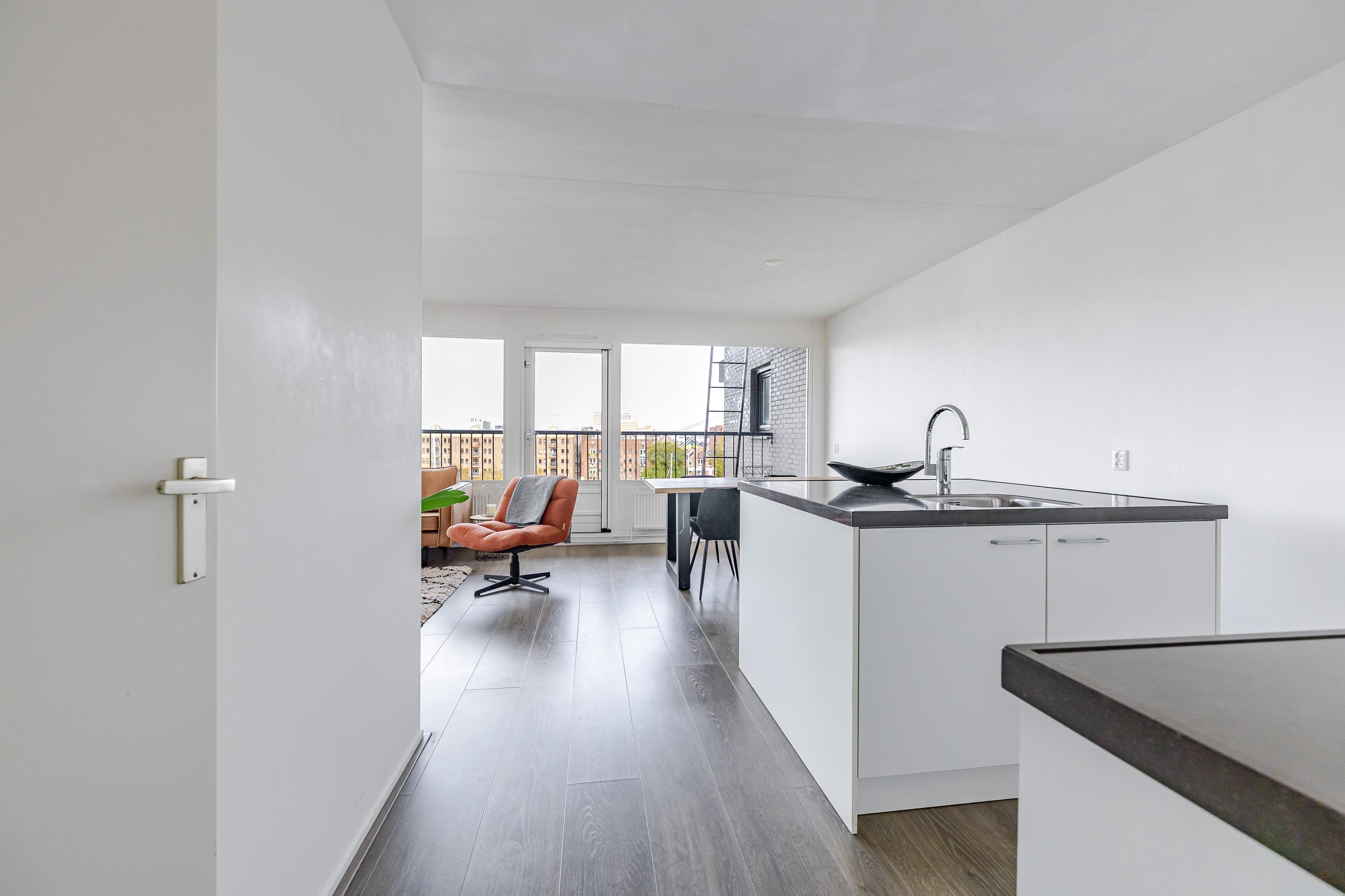 Indeling: entree, lift naar vijfde woonlaag, entree appartement, gang met toilet, badkamer, twee slaapkamers, woonkamer met open keuken, toegang tot balkon. Op de begane grond is een fietsenberging.