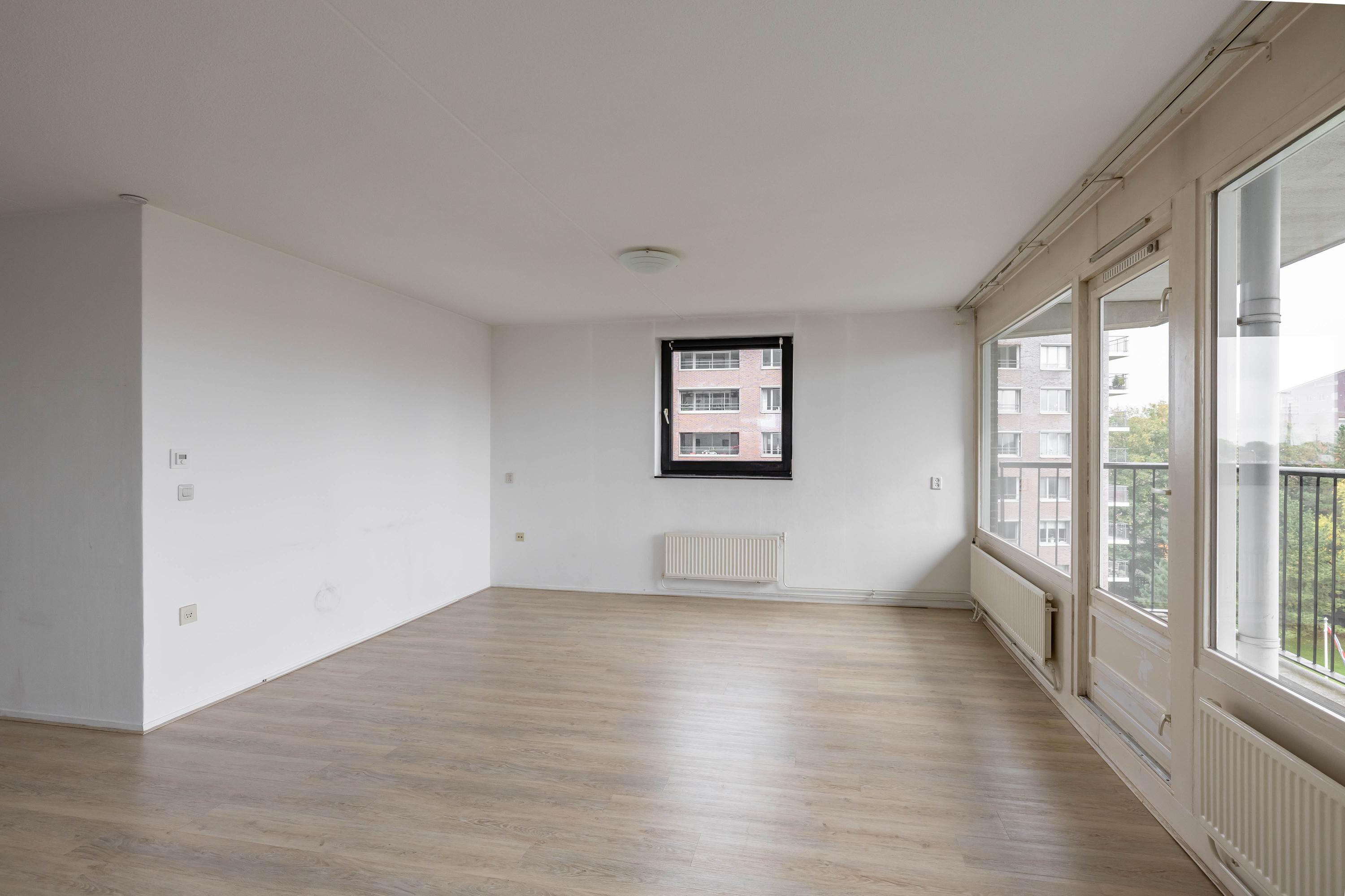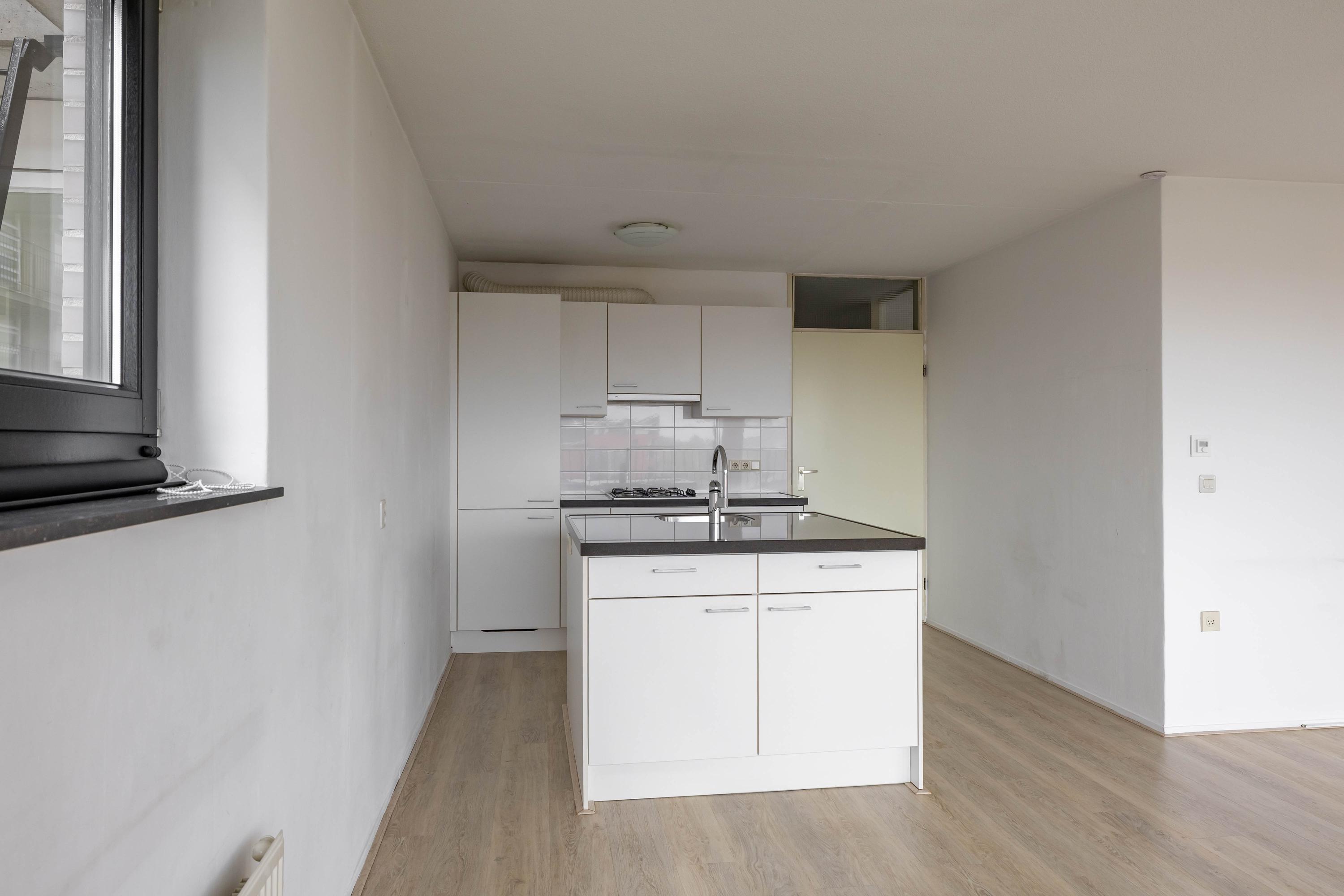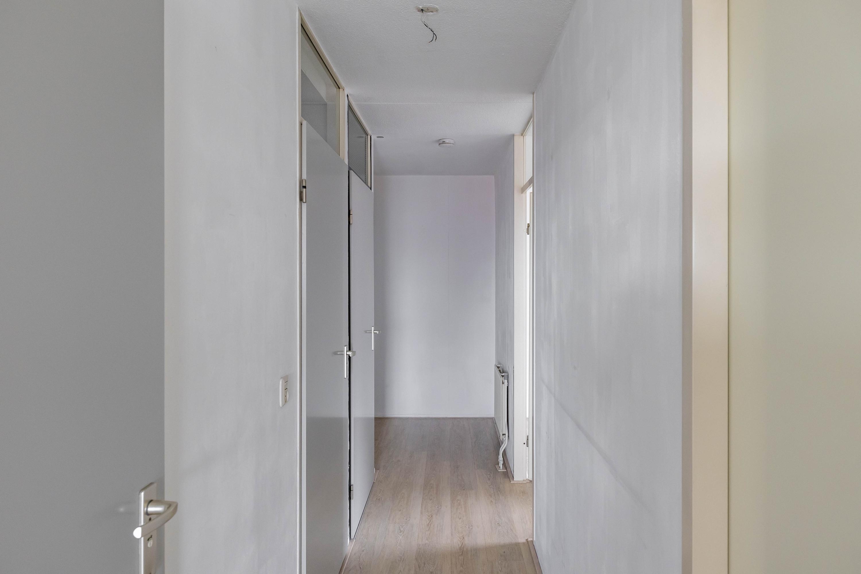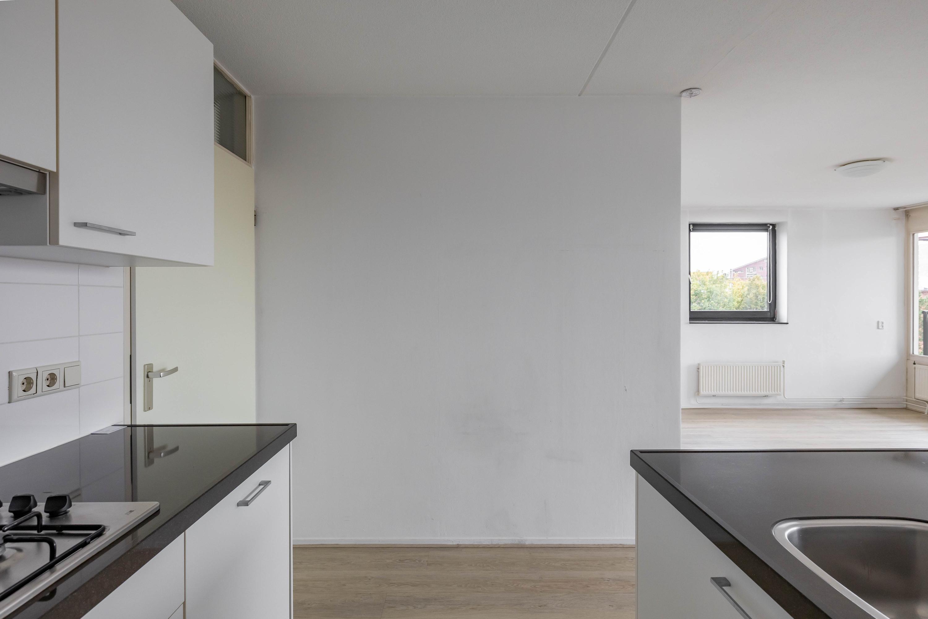 Indeling: entree, lift naar vijfde woonlaag, entree appartement, gang met toilet, badkamer, twee slaapkamers woonkamer met open keuken, toegang tot balkon. Op de begane grond is een fietsenberging.
