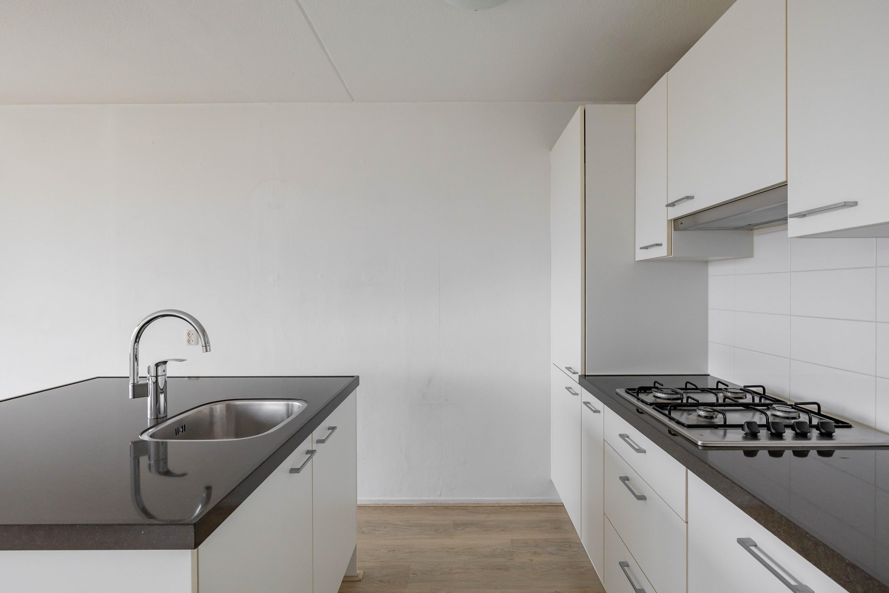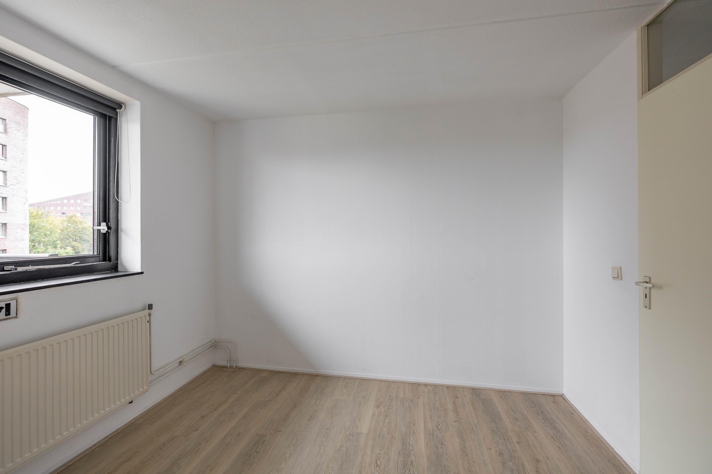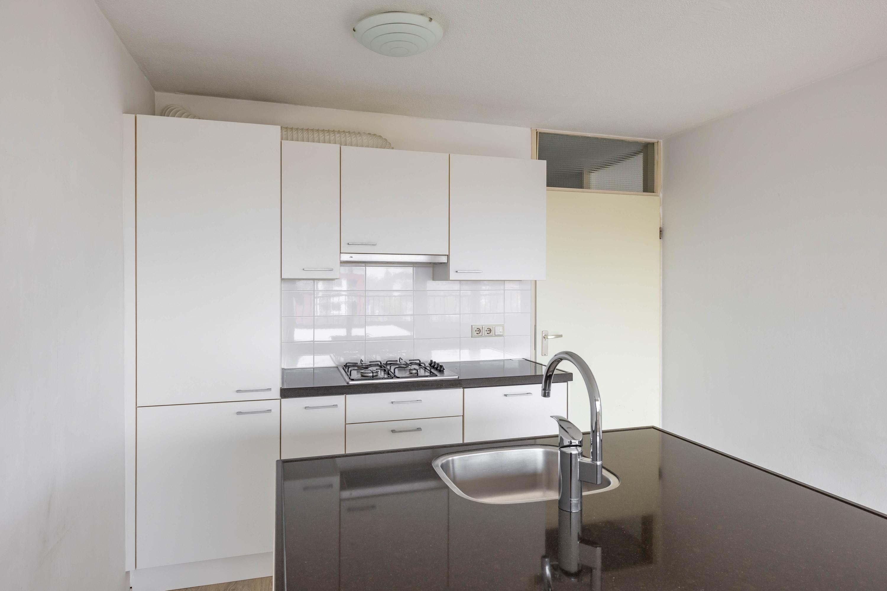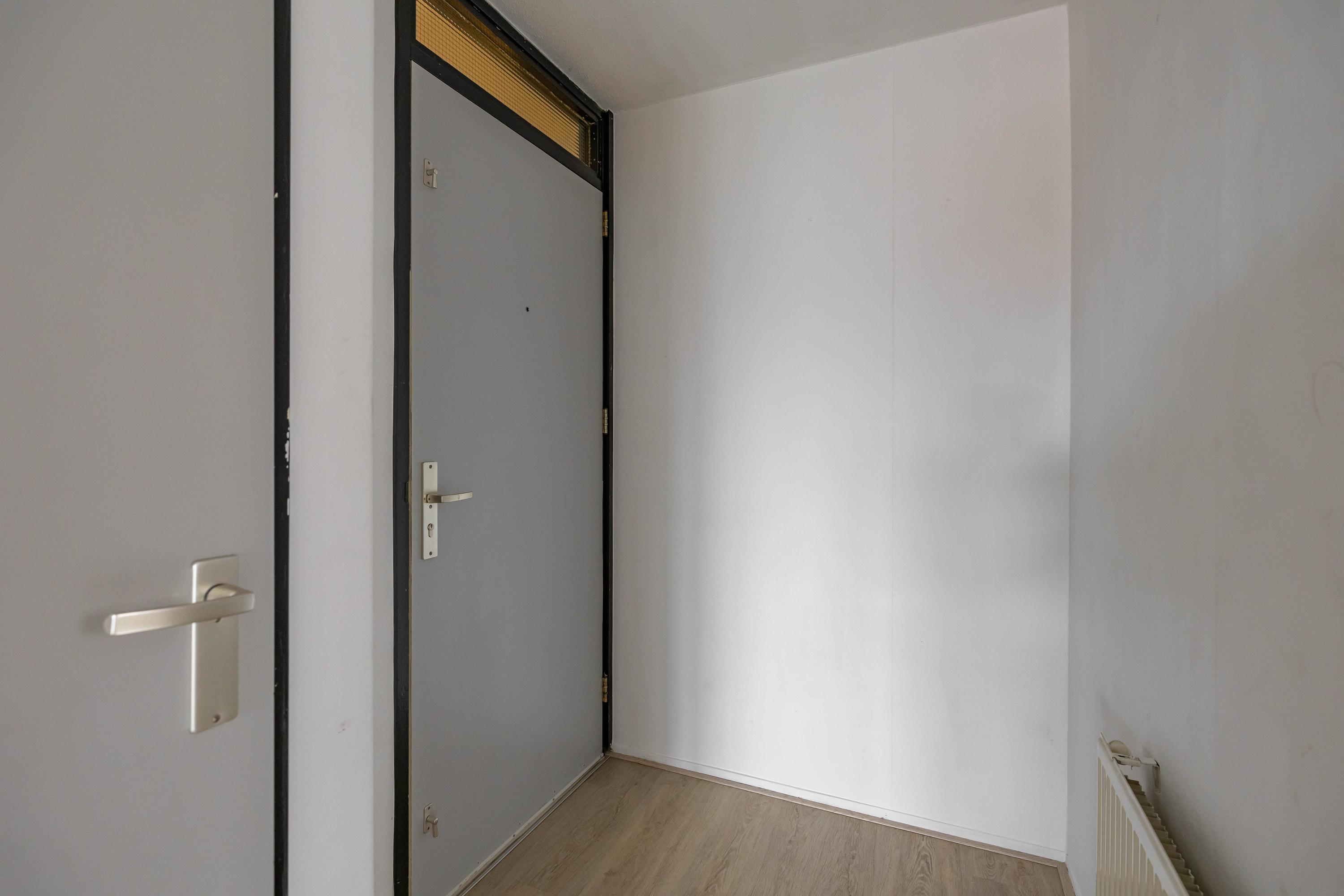 Indeling: entree, lift naar vijfde woonlaag, entree appartement, gang met toilet, badkamer, twee slaapkamers woonkamer met open keuken, toegang tot balkon. Op de begane grond is een fietsenberging.